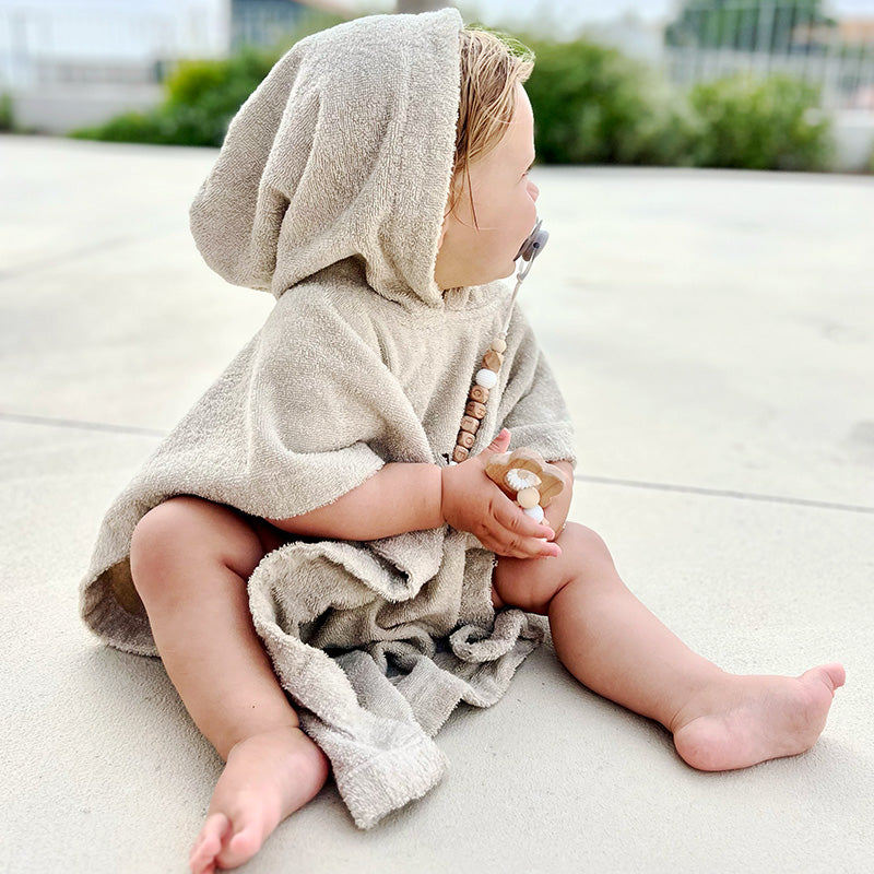 Poncho met naam van badstof. Kraamcadeau verkrijgbaar in verschillende kleuren: beige, groen, blauw...