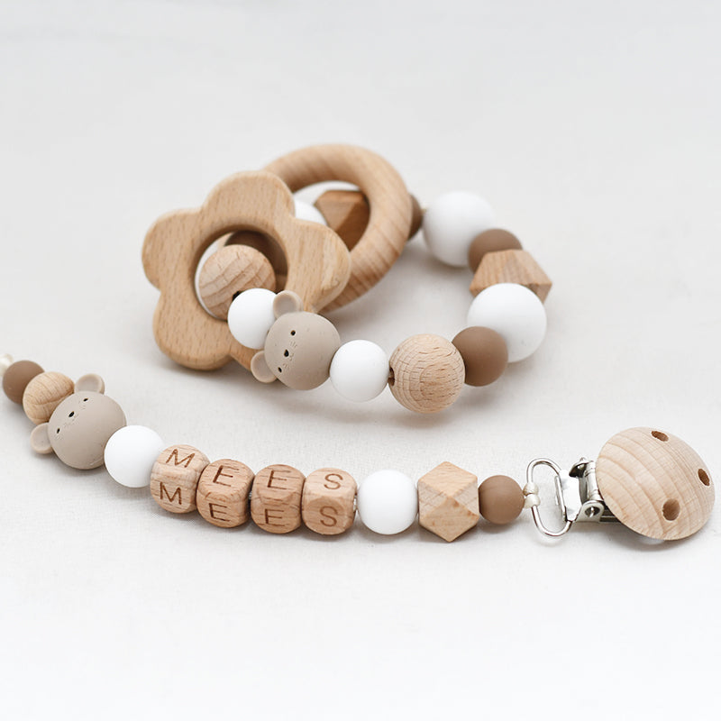 Maak het helemaal af met onze bijpassende speenkoord met naam en wagenspanner met naam. Bestel de bijtring als set en ontvang een stijlvolle, handige collectie babyaccessoires die perfect bij elkaar passen. Zo heb je alles in één keer, handig én mooi! Tevens krijg je bij het bestellen van een hele set korting op de setprijs.