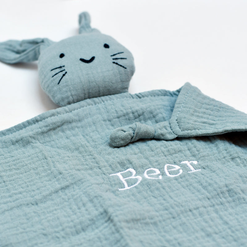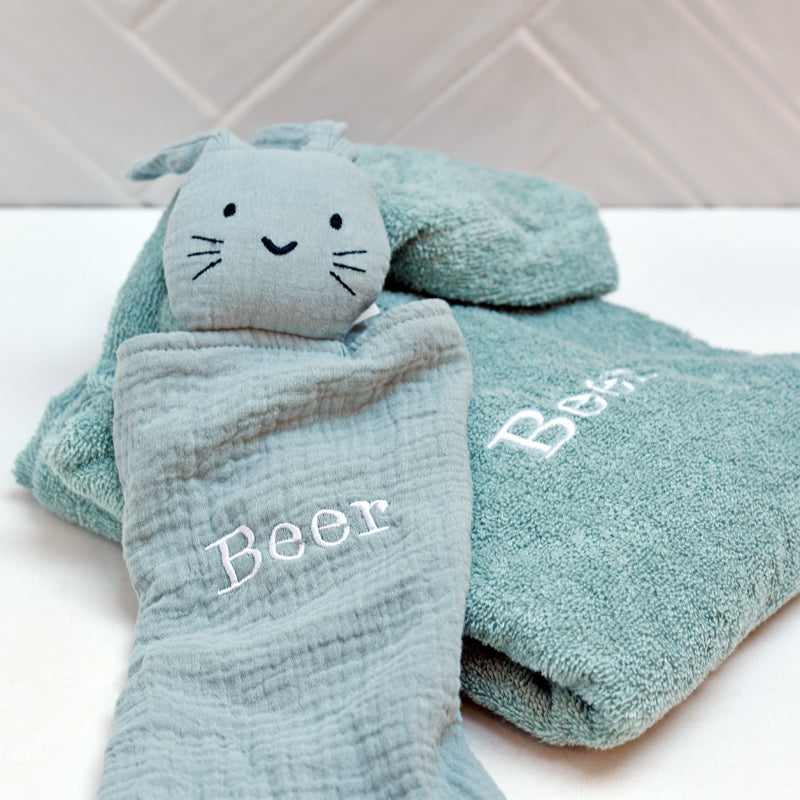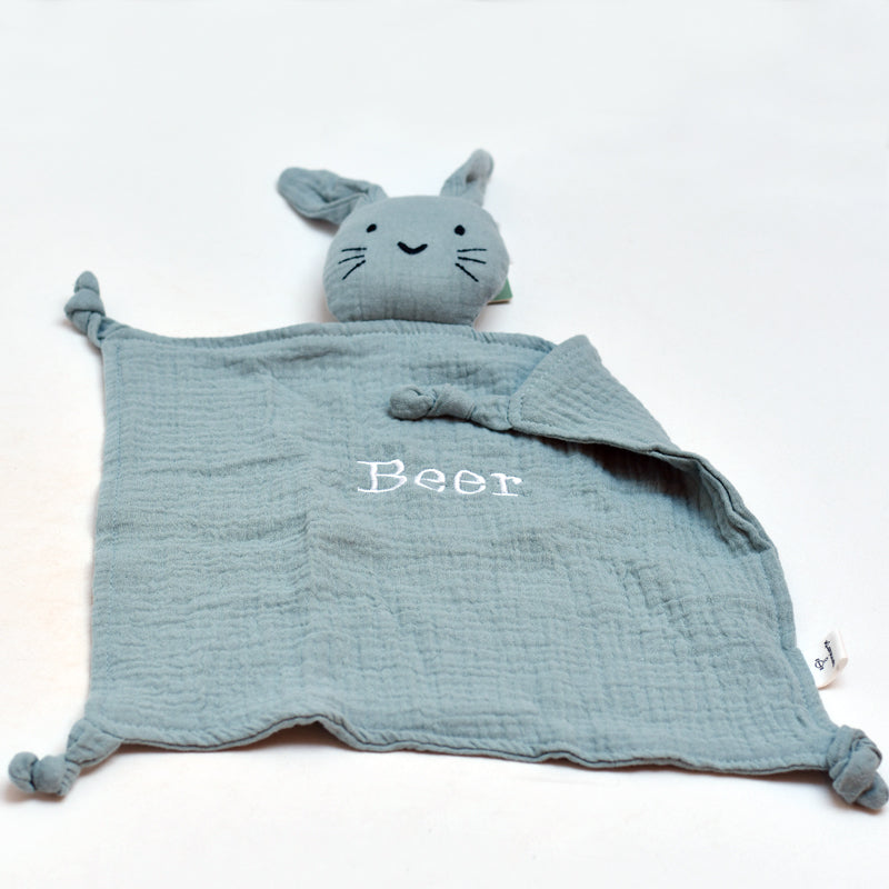 Laat de naam van je kindje borduren op dit hydrofiel knuffelkonijn en geef een bijzonder en praktisch cadeau. Perfect voor kraamvisites, babyshowers of als speciaal geschenk voor je eigen kindje. Het knuffelkonijn is verkrijgbaar in verschillende kleuren.
