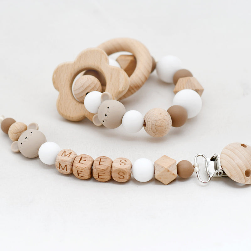 Maak het helemaal af met onze bijpassende bijtring en wagenspanner. Bestel het speenkoord met naam als set en ontvang een stijlvolle, handige collectie babyaccessoires die perfect bij elkaar passen. Zo heb je alles in één keer, handig én mooi! Tevens krijg je bij het bestellen van een hele set korting op de setprijs.