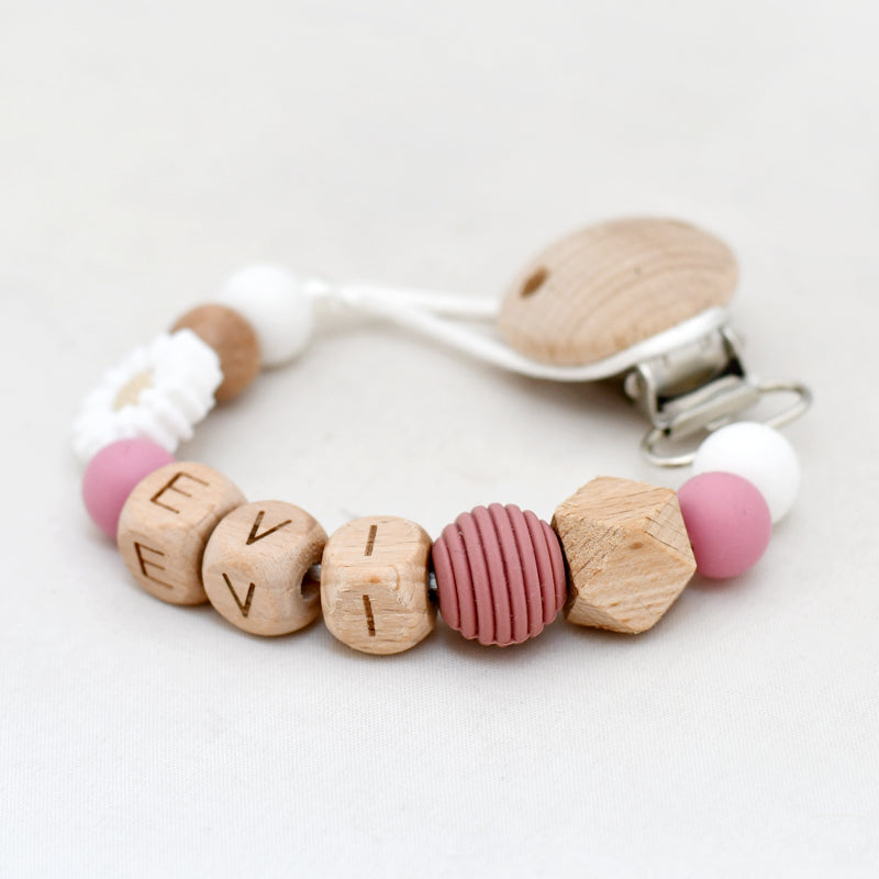 Speenkoord met naam met roze madelief en houten letter kralen. Perfect als kraamcadeau of als uniek accessoire voor je eigen baby.
