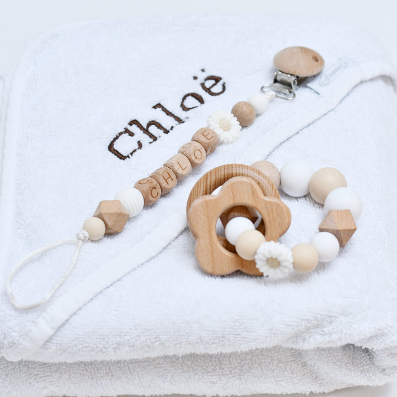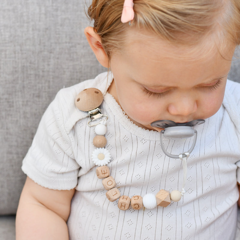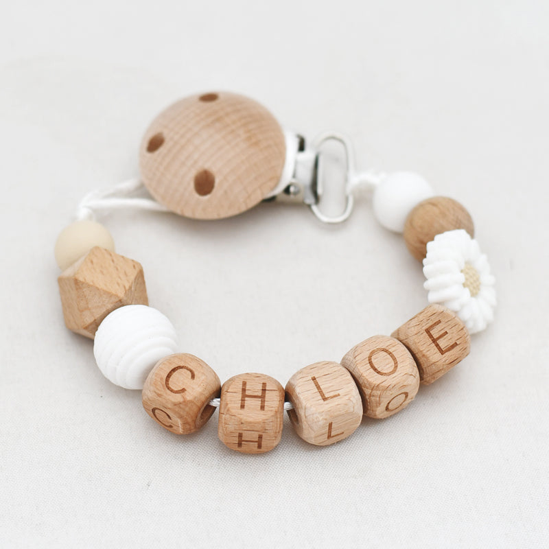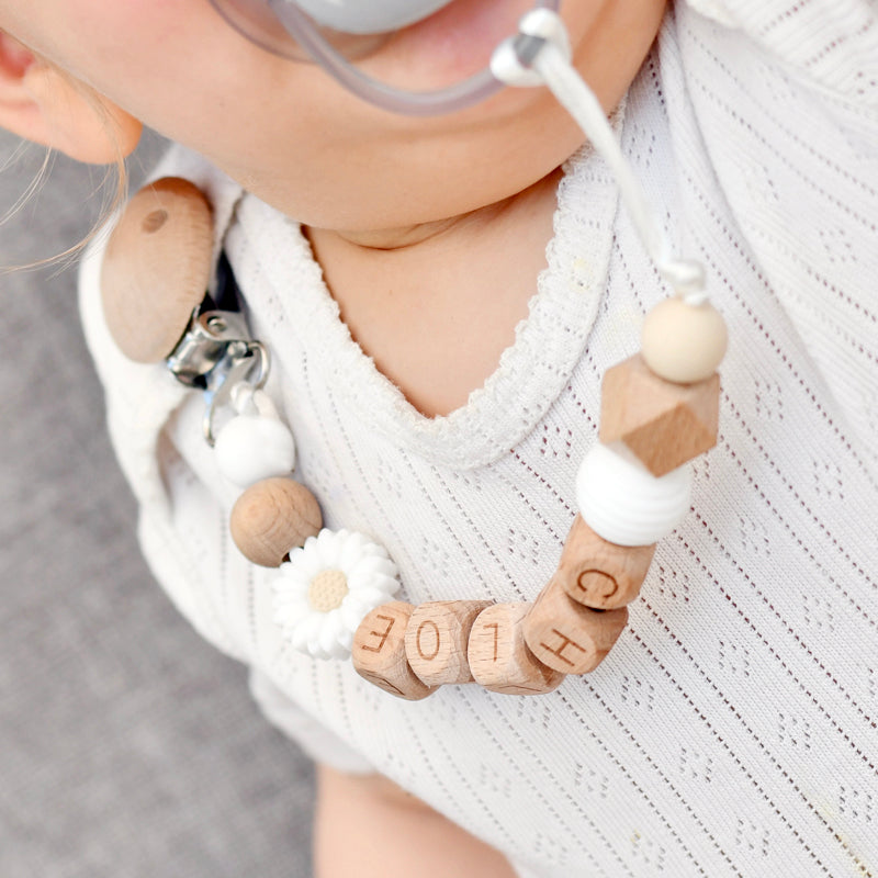 Speenkoord met naam met witte madelief en houten letter kralen.